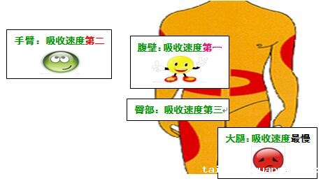 不同注射部位对胰岛素的吸收速度不同,按由快至慢的速度分为:腹部、手臂上及外侧、大腿前及外侧、臀部。所以可以根据不同规格胰岛素起效时间的快慢选择部位,如注射短效胰岛素推荐注射在腹部;而注射中效胰岛素推荐注射在大腿外侧。由于在同一部位反复注射可能会产生硬结,所以应有规划的轮换注射部位和区域(每次注射间距应在2.5厘米以上),可按照左右对称轮换的原则注射。
